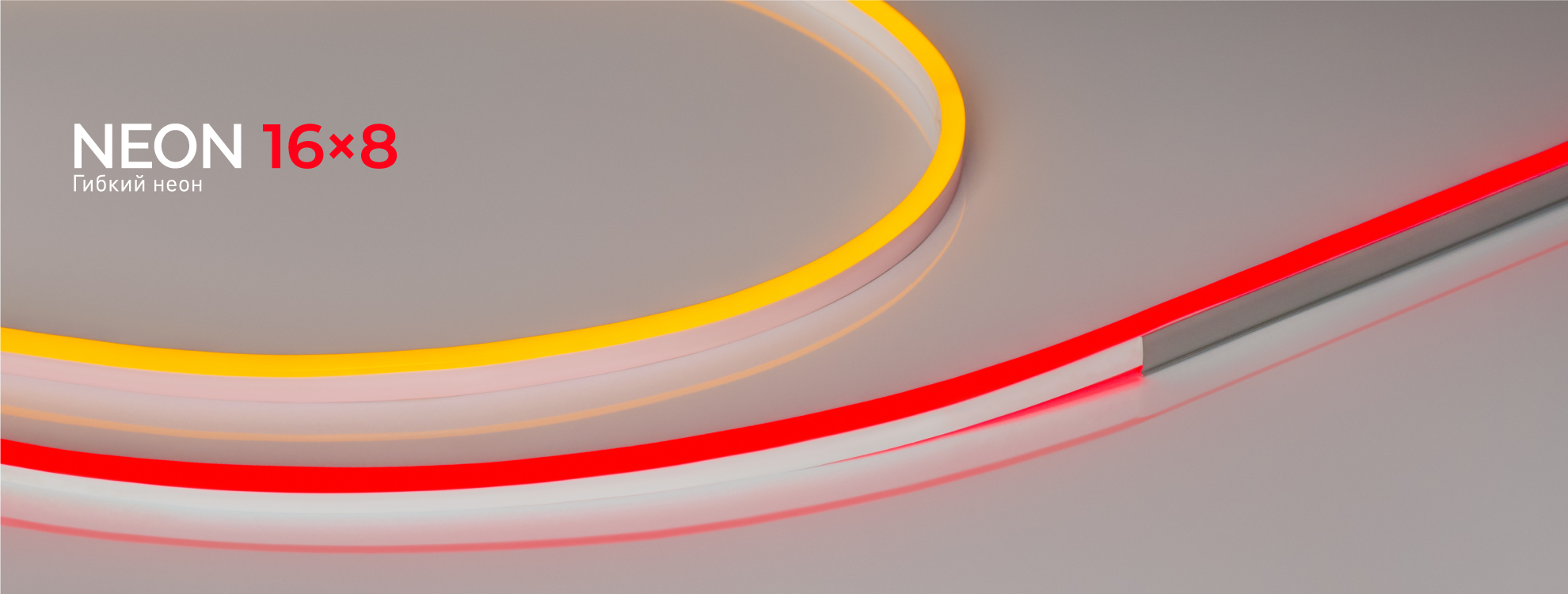 Гибкий неон NEON — отличное решение для декоративной подсветки ступеней, рекламных конструкций, а также для оформления кафе, баров, ванных и детских комнат. За счет прямоугольного сечения 16×8 мм гибкий неон легко встраивается в профиль и небольшие углубления в мебели. В серии представлены модели с безопасным напряжением 24 В.