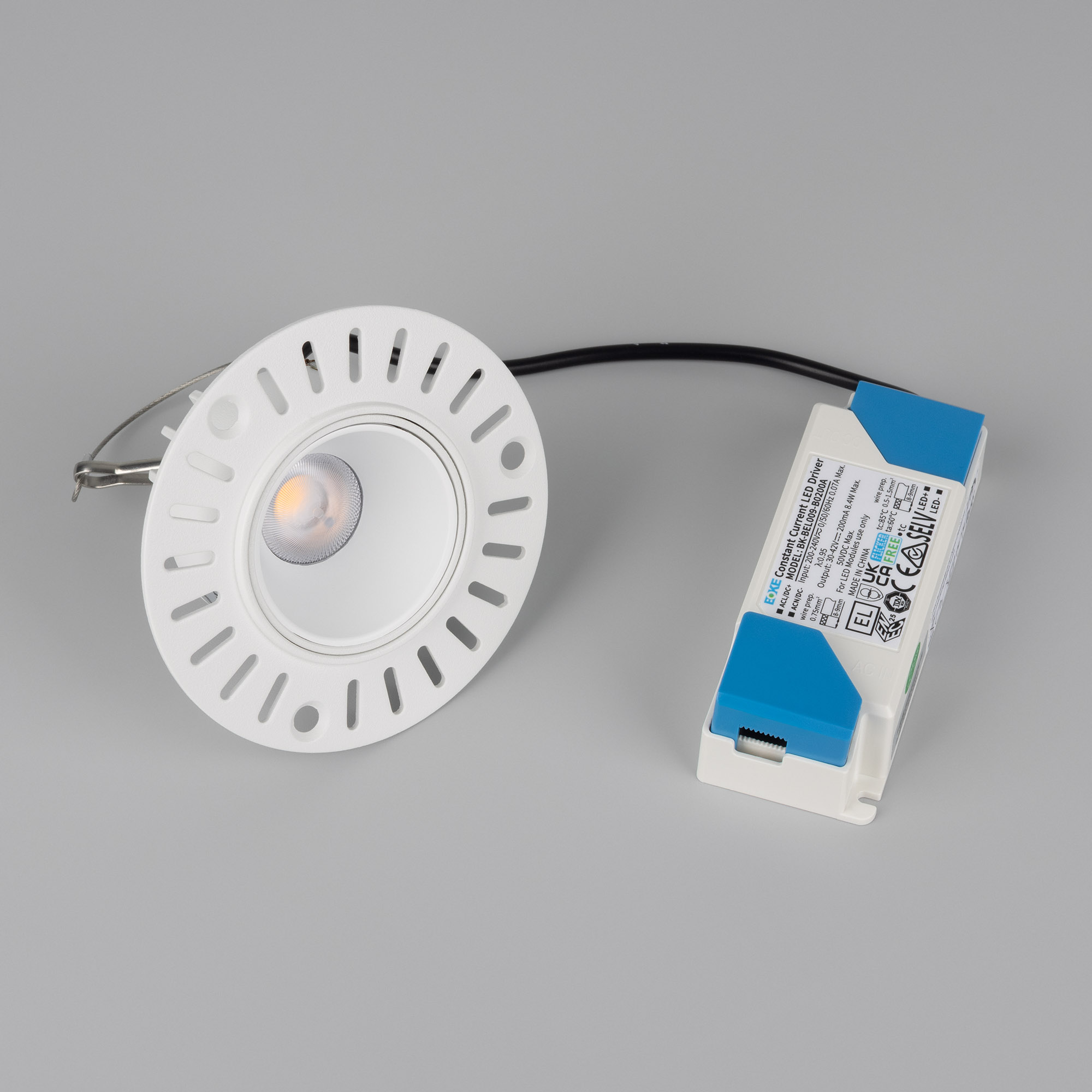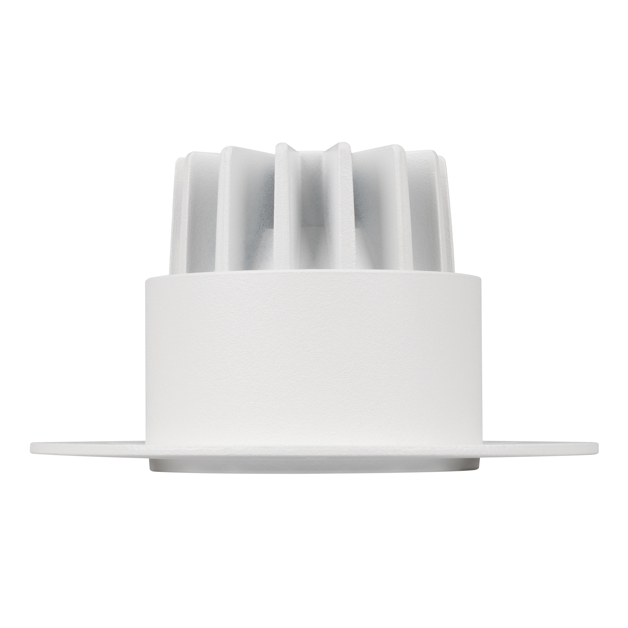 Встраиваемый безрамочный светильник под шпаклевку. Мощность 8.4 Вт, св. поток 821 лм, 96 лм/Вт, дневной 4000 K, CRI>90, угол 32°, напряжение питания 230 В. Белый круглый корпус из алюминия, белый МАТОВЫЙ отражатель из PMMA, степень защиты IP20. Размер: диаметр 90 мм, высота 52 мм. Монтаж встраиваемый, установочное отверстие диаметр 65 мм. Драйвер 21-42 В, 200 мА, пульсация <2%.