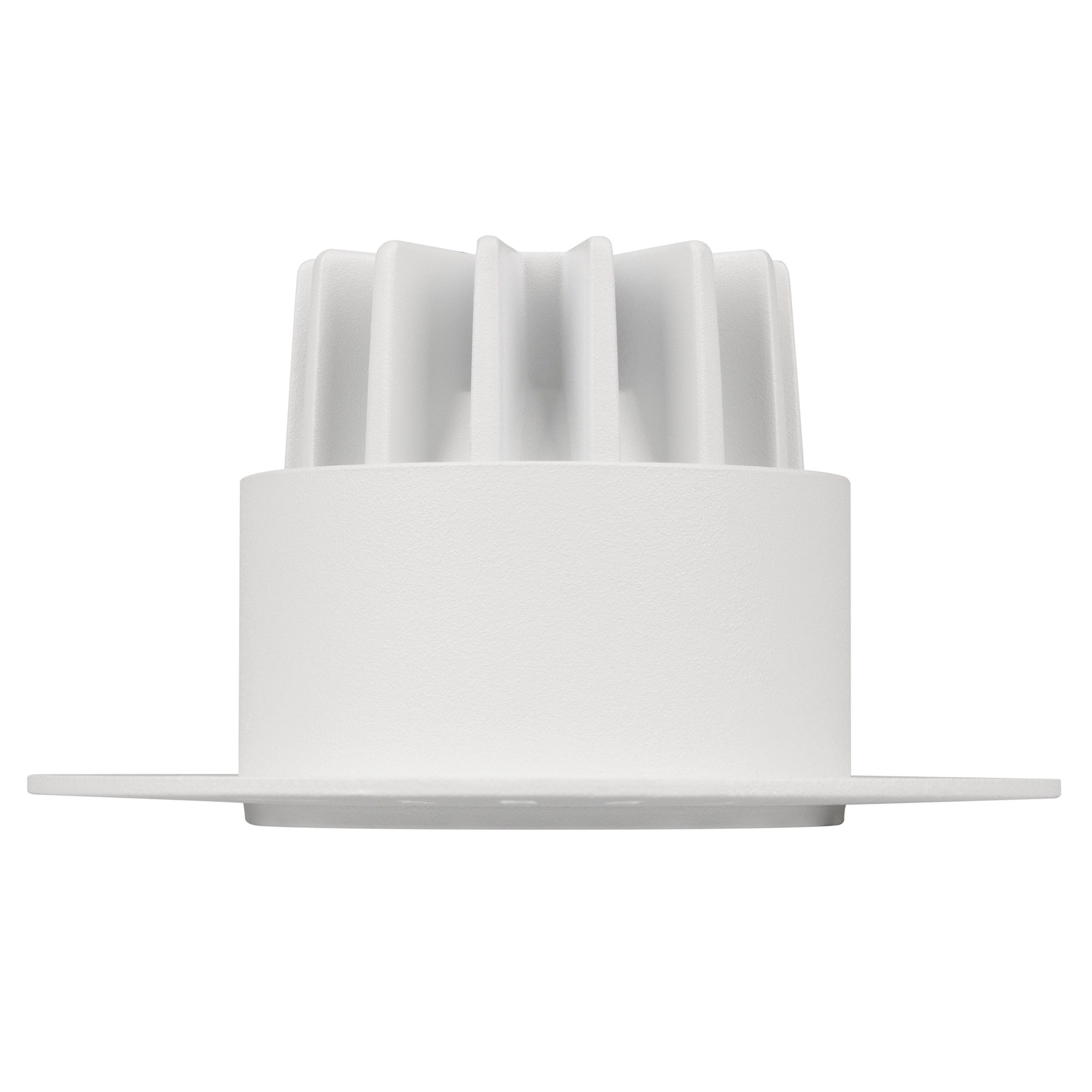 Встраиваемый безрамочный светильник под шпаклевку. Мощность 6.3 Вт, св. поток 552 лм, 83 лм/Вт, тёплый 3000 K, CRI>90, угол 40°, напряжение питания 230 В. Белый круглый корпус из алюминия, белый МАТОВЫЙ отражатель из PMMA, степень защиты IP20. Размер: диаметр 90 мм, высота 52 мм. Монтаж встраиваемый, установочное отверстие диаметр 65 мм. Драйвер 28-42 В, 150 мА, пульсация <2%.