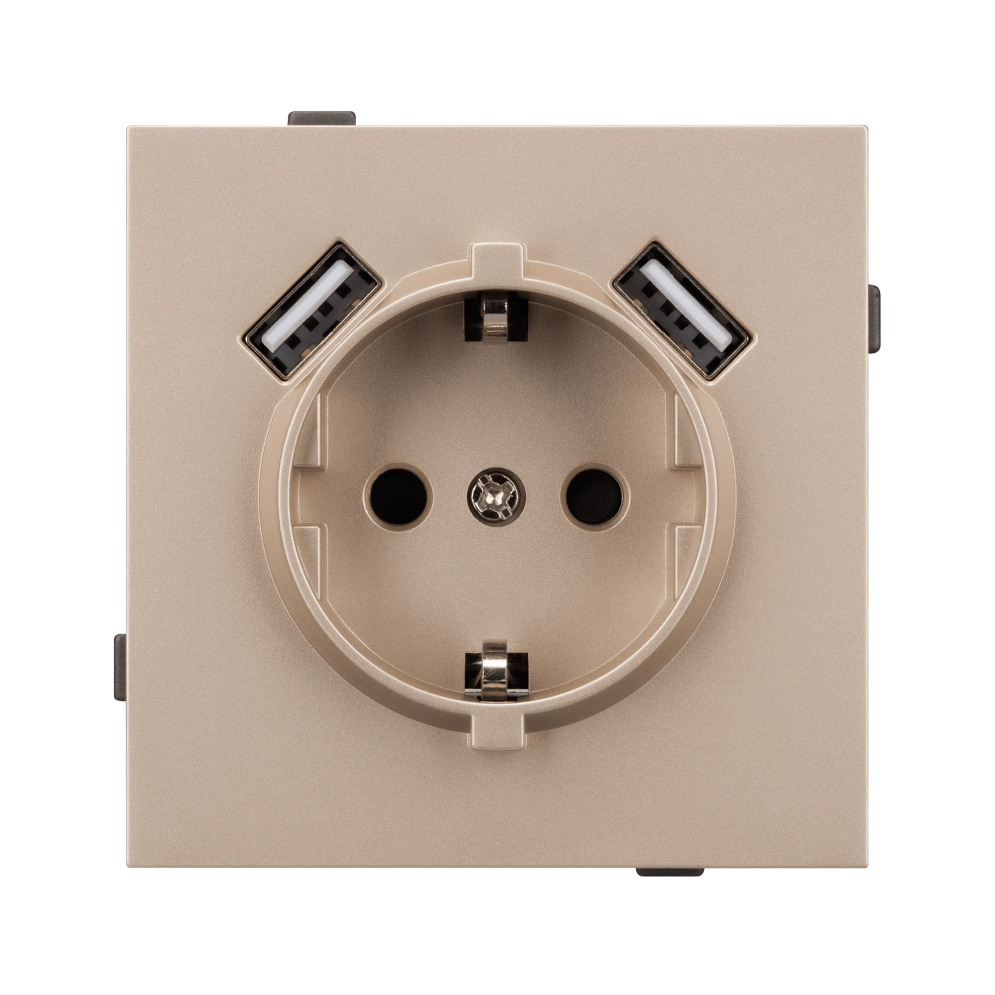 Механизм розетки с заземлением на 1 пост и 2USB Type A порта. Цвет - золотой. Без фронтальной рамки. Уровень пылевлагозащиты IP20. Розетка устанавливается в стандартный подрозетник круглого сечения диаметром 60мм. Габаритные размеры: длина 71 мм, ширина 71 мм, высота 53 мм. Гарантийный срок 10 лет.