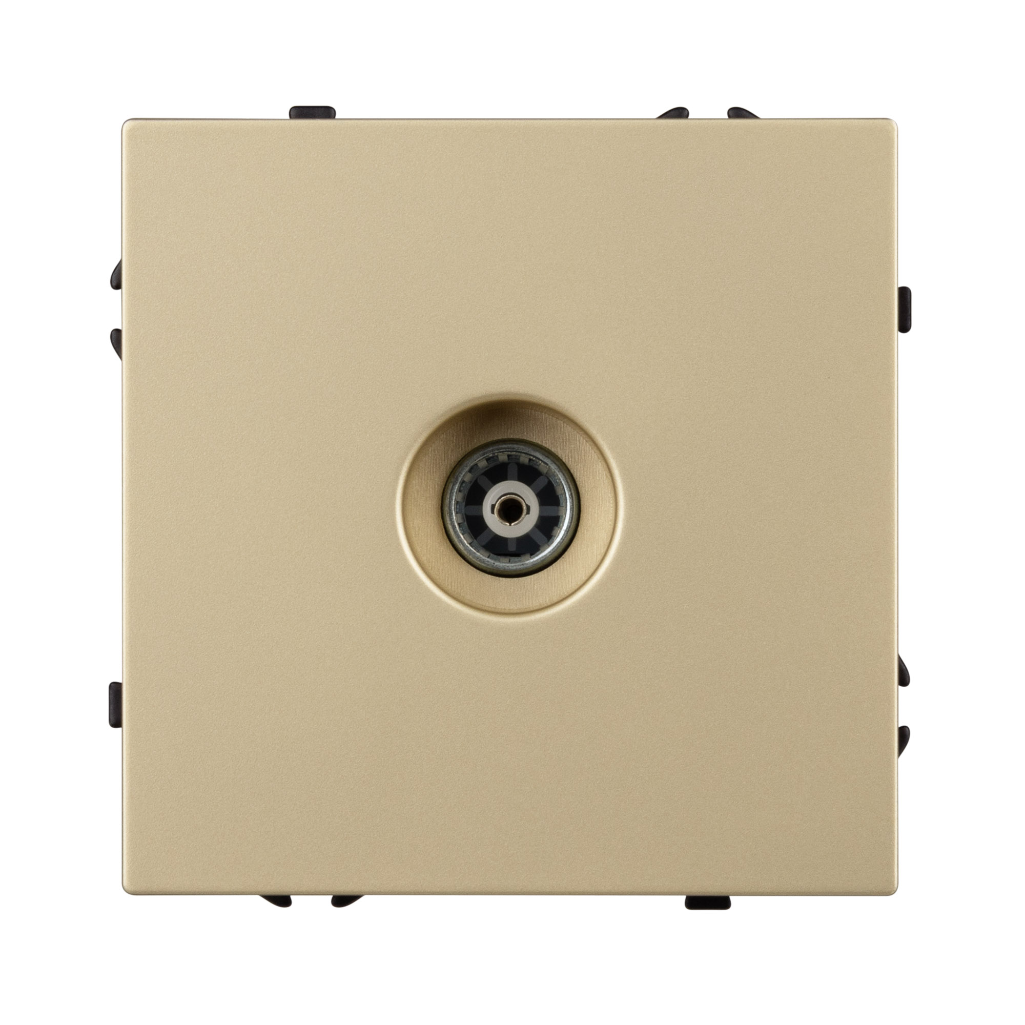 Строгие геометрические линии гармонично сочетаются с функциональностью продуманных механизмов, создавая идеальное решение для дизайн-проектов, где важны как эстетика, так и практичность. Механизм ТВ-розетки совместим с рамками серии NOBE, создает утонченный минималистичный вид. Скрытый тип монтажа позволяет гармонично встроить в интерьер любого современного дизайн-проекта. Видимая часть выполнена из высококачественного пластика цвета золотой песок и имеет Soft-Touch покрытие, что придает изделию приятные тактильные ощущения и стильный внешний вид. Механизм ТВ-розетки предназначена для подключения кабельного телевидения, путем подсоединения коаксиального кабеля к винтовому зажиму. Усиленные распорные лапки двойного захвата надежно фиксируют устройство в установочном подрозетнике круглого сечения диаметром 60мм. Суппорт окрашен в черный матовый цвет и выполнен из металла толщиной 1,5мм, что обеспечивает безопасность и уверенность в установке. На каждой стороне суппорта размещены фиксирующие элементы, позволяющие комбинировать механизмы в системы до 5шт как горизонтально, так и вертикально.