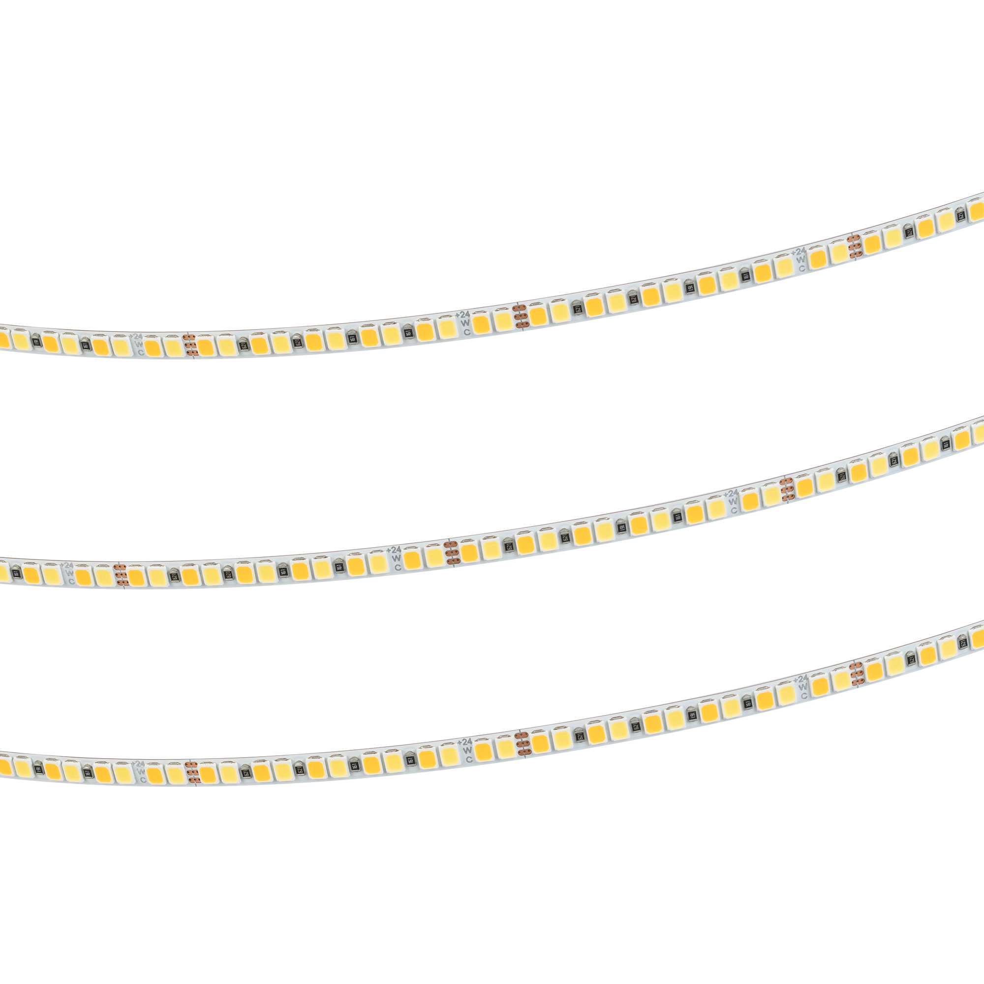 2-канальная узкая лента шириной 5 мм с изменяемым цветом свечения: белым (6000 K) и теплым белым (2700 K). Светодиоды SMD 2835 (240 шт/м) с высоким индексом цветопередачи (CRI>90). Мощность 10 Вт/м, напряжение питания 24 В. Минимальный отрезок 50 мм (12 светодиодов). Предназначена для освещения помещений и декоративной подсветки интерьеров: торцевой подсветки, подсветки стеклянных полок, элементов мебели, ниш, декора. Светодиоды двух оттенков белого цвета позволяют плавно менять цветовую температуру.