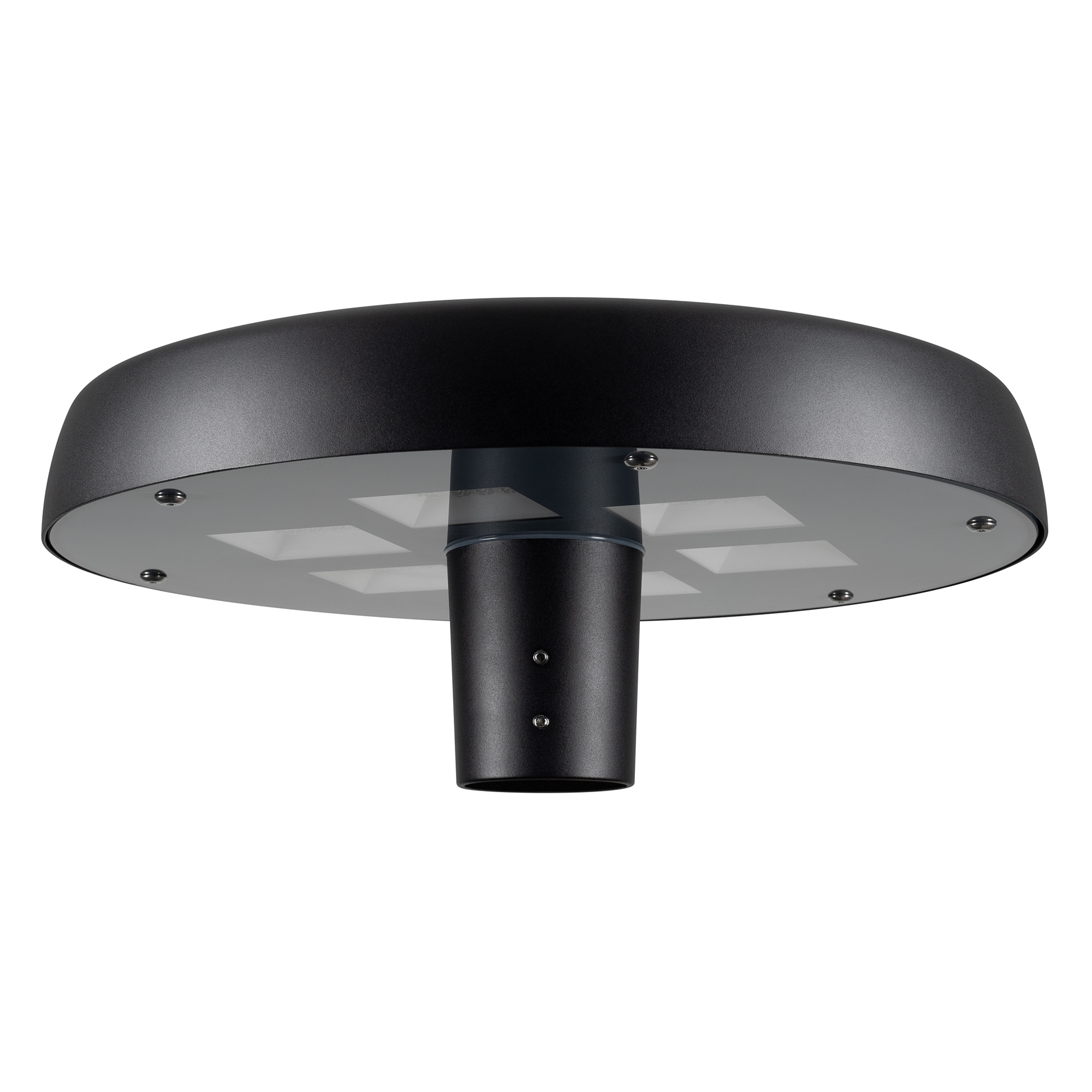 Поставка под заказ от 5 шт. Венчающий светодиодный светильник. Мощность 50 Вт, св. поток 5680 лм, 112 лм/Вт, дневной 4000 K, CRI>80, угол 140°, напряжение питания 230 В. Черный корпус из алюминия, экран закаленное стекло, степень защиты IP65. Размер: диаметр 510 мм, высота 200 мм. Монтаж на вертикальную опору диаметром 76 мм.