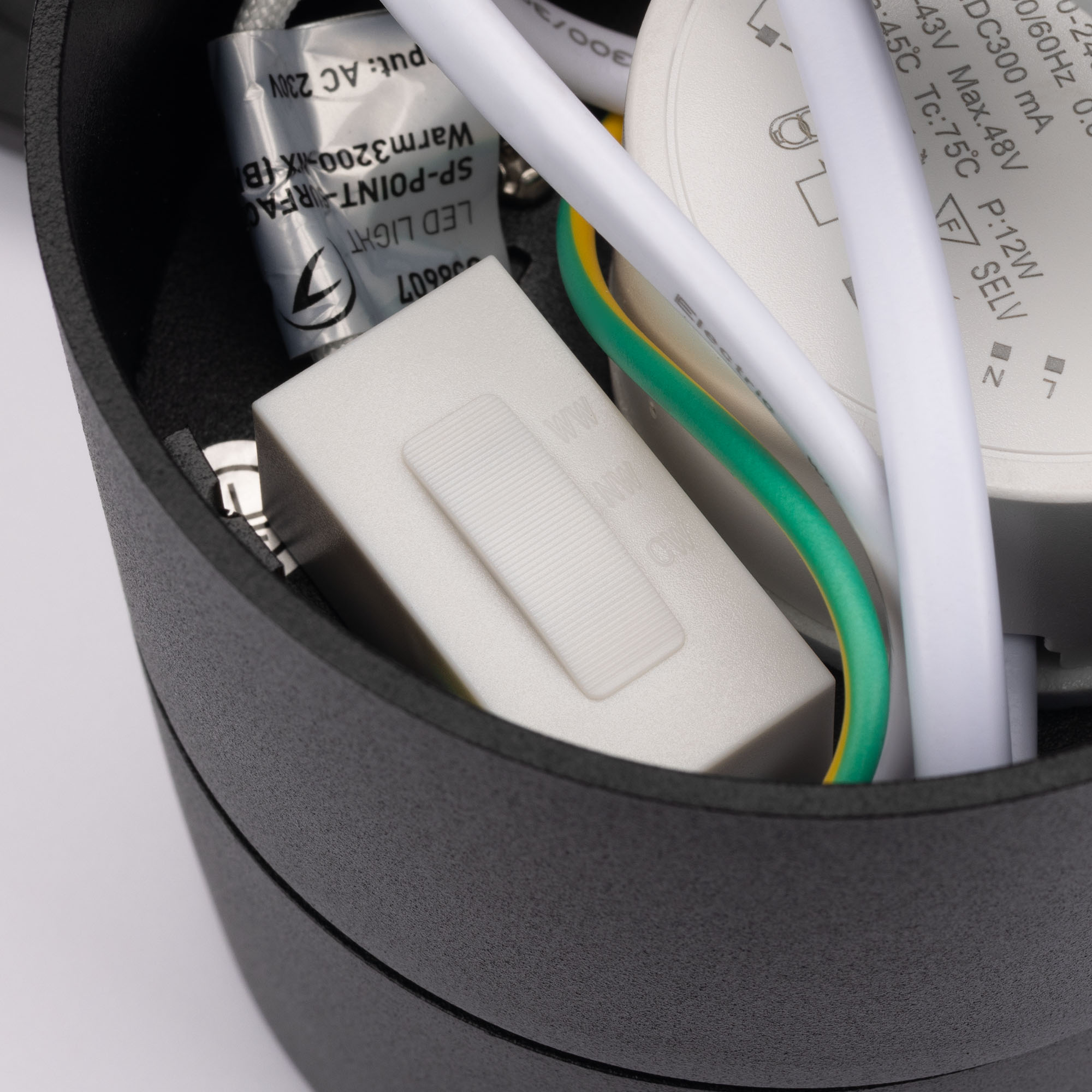 Накладной откидной поворотный светильник с изменяемой цветовой температурой. Мощность 12 Вт, св. поток с решеткой honeycomb 750 лм, св. эффективность 62 лм/Вт, теплый 2700 K, теплый 3200 K, дневной 4000K (переключается), CRI>90, угол свечения 15°, угол поворота 360°, угол наклона 90°. Черный круглый корпус из алюминия, степень защиты IP20. Размер: диаметр Ø85 мм, высота 95 мм. Питание AC 220-240V, 12Вт, драйвер встроенный (300mA, 27-43V). Пульсация <1%.