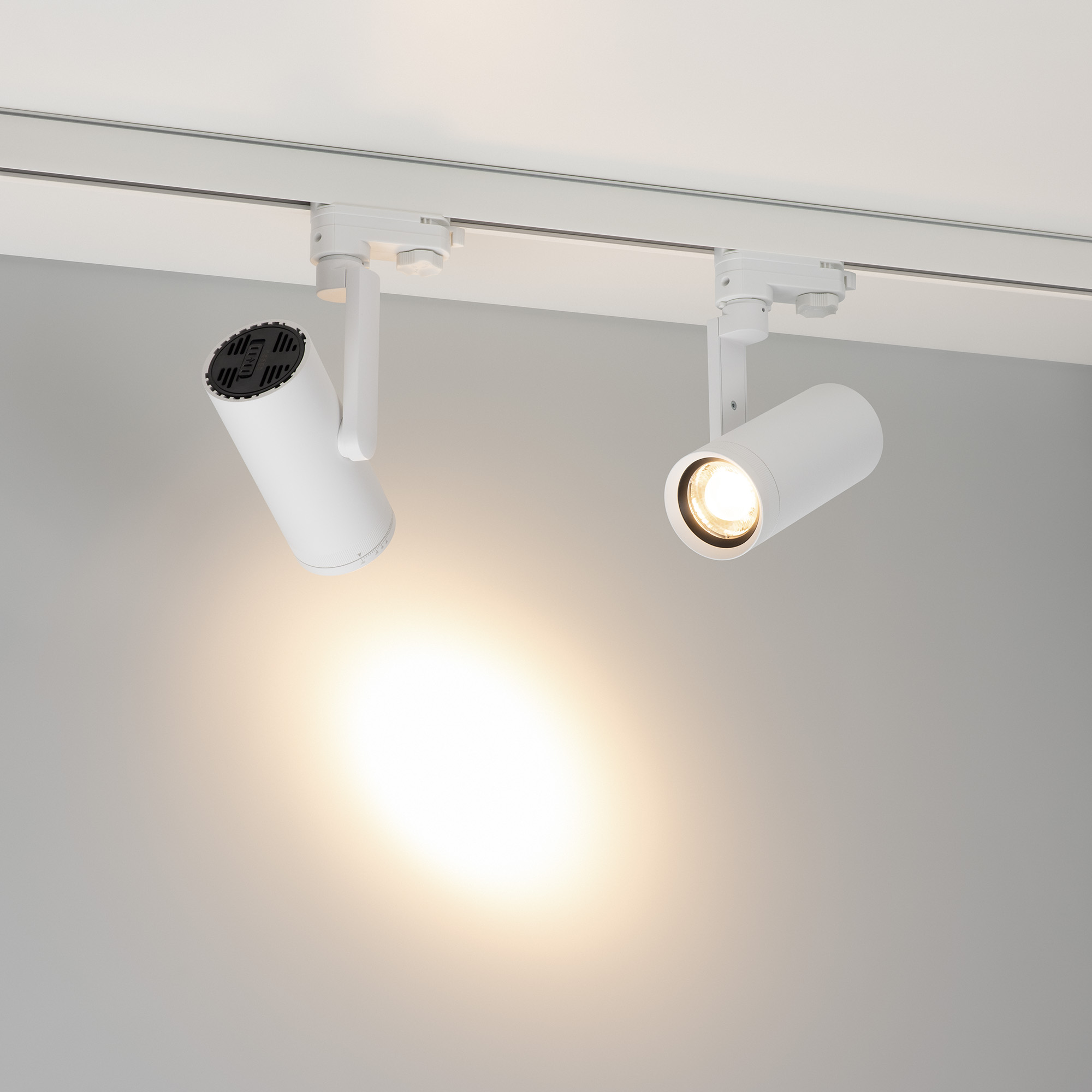 Светильник для треков/шин 4 провода, 10 Вт. Цвет свечения меняется в диапазоне 2700K/3000K/3500K/4000K/5700K (при помощи переключателя на корпусе), световой поток 560-830лм, регулируемый угол 20-50°, CRI>90. Корпус круглый, алюминий, цвет белый, IP20. Угол наклона корпуса 90°, угол поворота корпуса 330°. Габариты LxWxH: 83х65x245мм. Размер светового модуля DxL: 65x150мм. Входное напряжение AC220-240V, мощность 10Вт. Драйвер встроенный 30-40V, 230мА, 10Вт.
