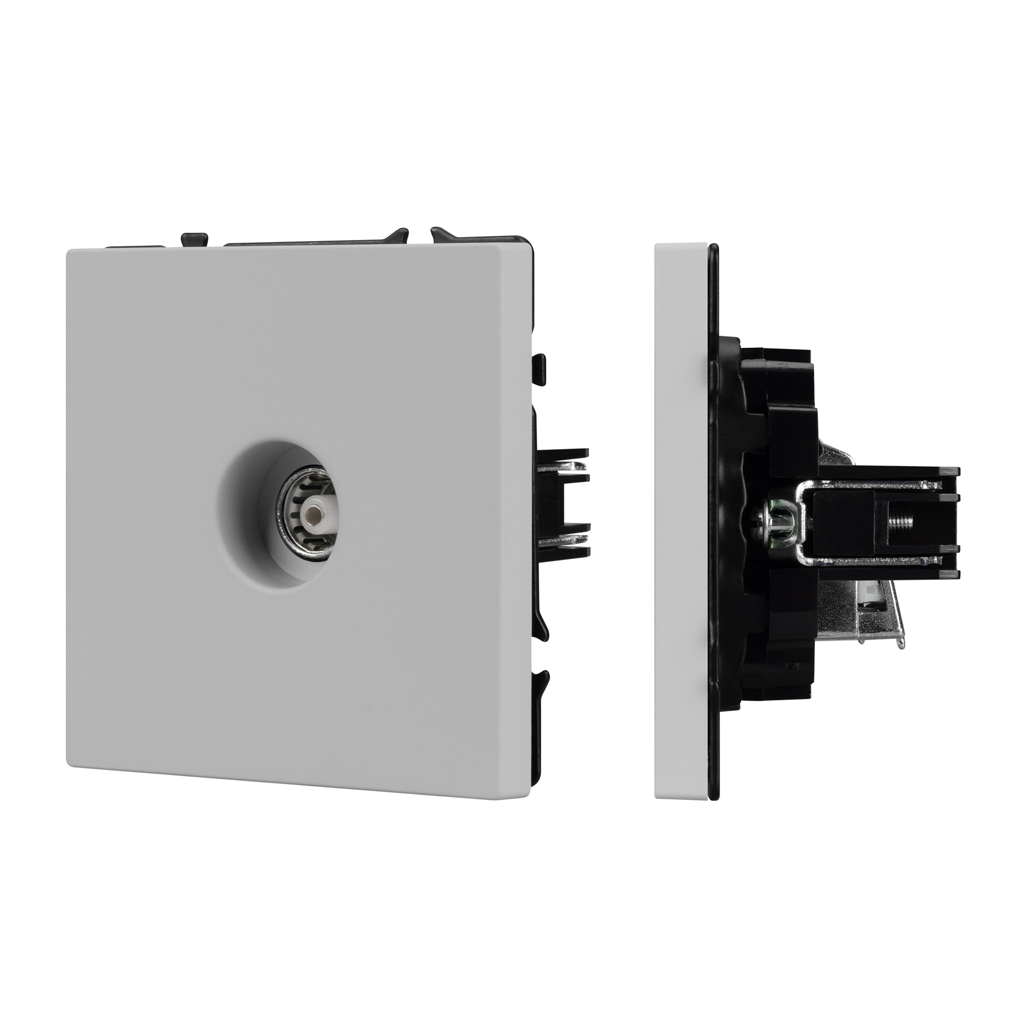 Строгие геометрические линии гармонично сочетаются с функциональностью продуманных механизмов, создавая идеальное решение для дизайн-проектов, где важны как эстетика, так и практичность. Механизм ТВ-розетки совместим с рамками серии NOBE, создает утонченный минималистичный вид. Скрытый тип монтажа позволяет гармонично встроить в интерьер любого современного дизайн-проекта. Видимая часть выполнена из высококачественного пластика цвета никель и имеет Soft-Touch покрытие, что придает изделию приятные тактильные ощущения и стильный внешний вид. Механизм ТВ-розетки предназначена для подключения кабельного телевидения, путем подсоединения коаксиального кабеля к винтовому зажиму. Усиленные распорные лапки двойного захвата надежно фиксируют устройство в установочном подрозетнике круглого сечения диаметром 60мм. Суппорт окрашен в черный матовый цвет и выполнен из металла толщиной 1,5мм, что обеспечивает безопасность и уверенность в установке. На каждой стороне суппорта размещены фиксирующие элементы, позволяющие комбинировать механизмы в системы до 5шт как горизонтально, так и вертикально.