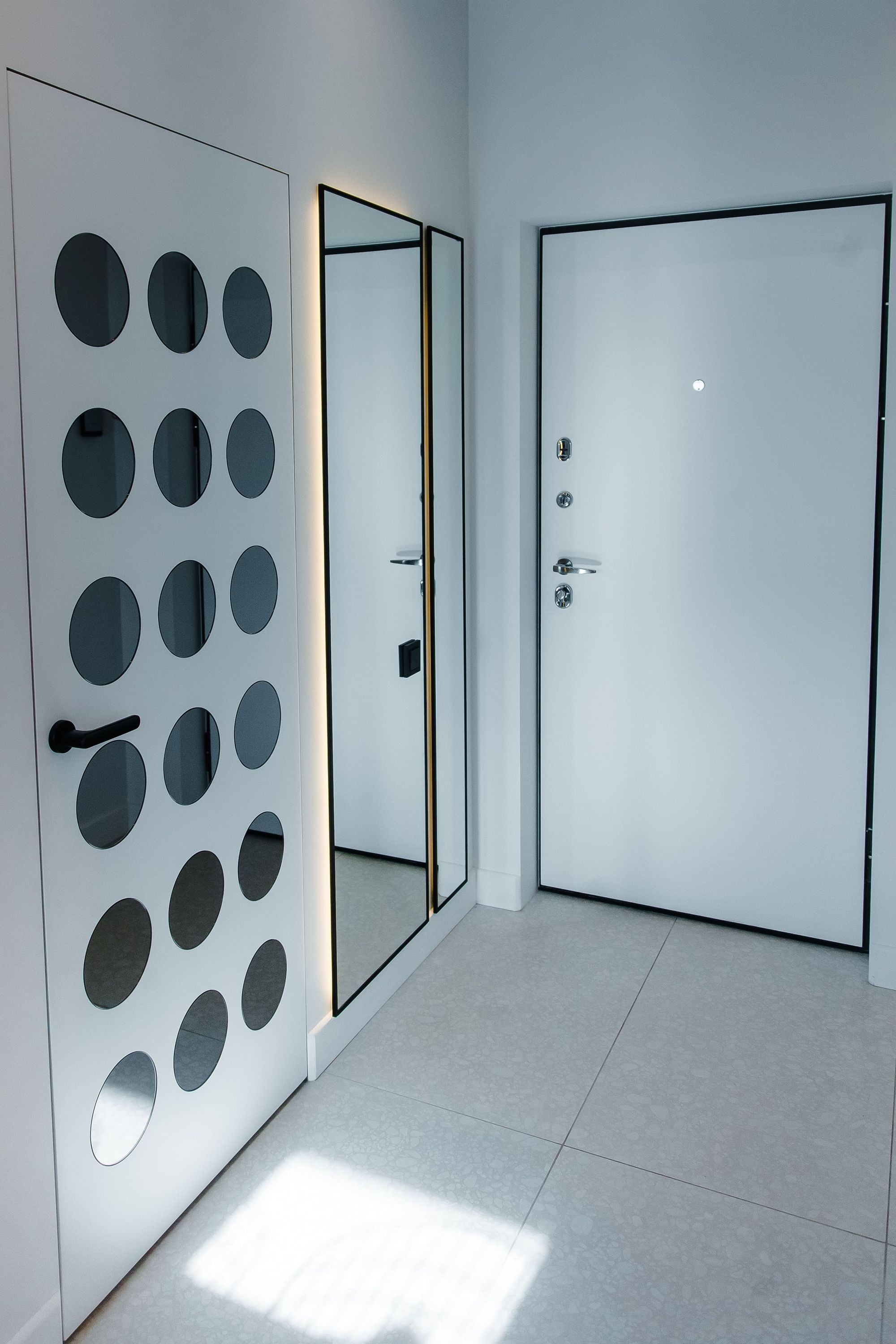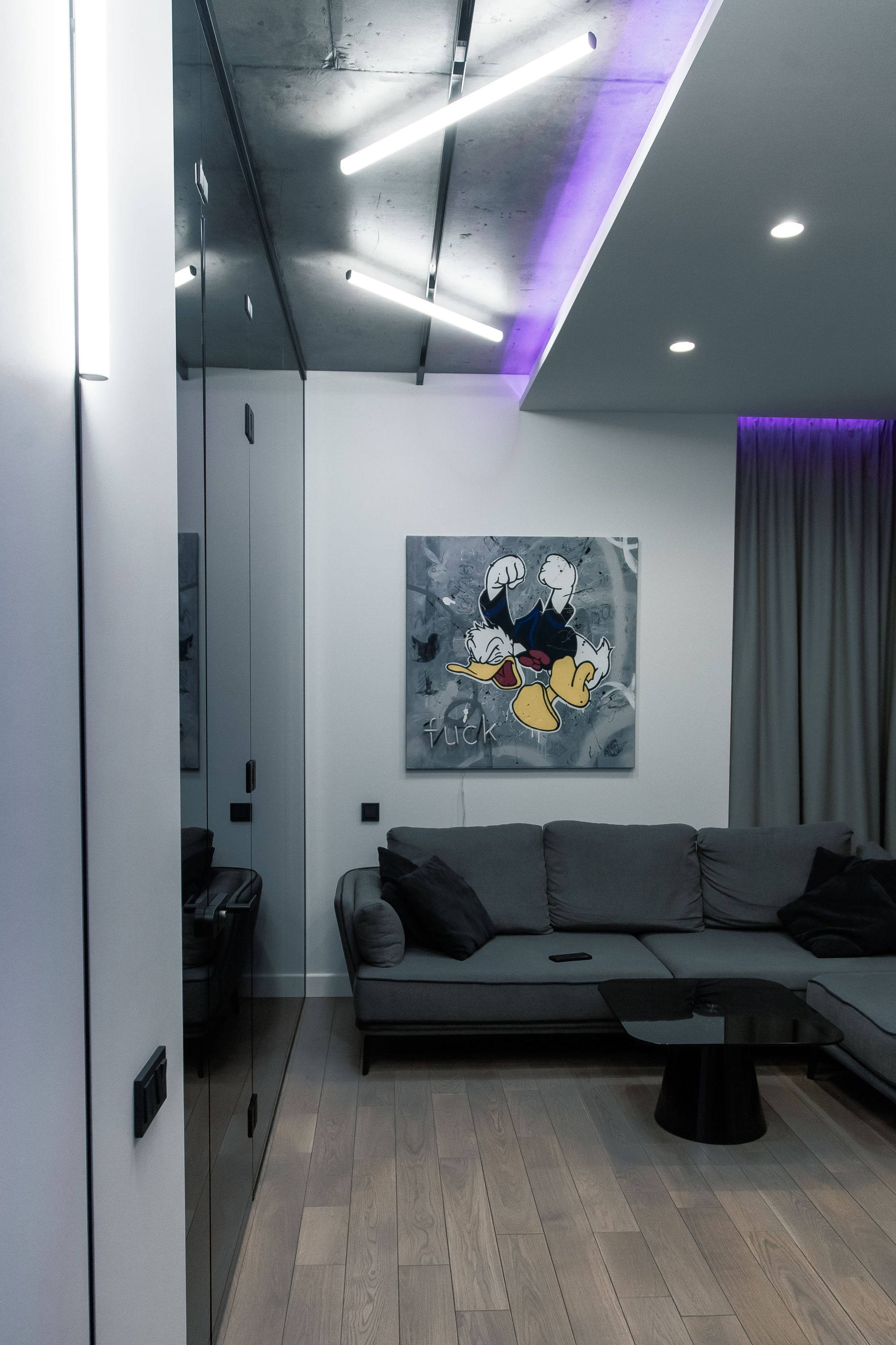 Основу интерьера частной квартиры составляет насыщенная серая цветовая гамма — от глубокого графитового оттенка до «лофтового» металлика. Пол теплого древесного цвета вносит в холодную монохромность ощущение уюта, а яркие цветные детали оживляют пространство. Картина с мультяшным героем, оригинальные текстуры и цветная подсветка создают в пространстве жизнерадостную и неформальную атмосферу.