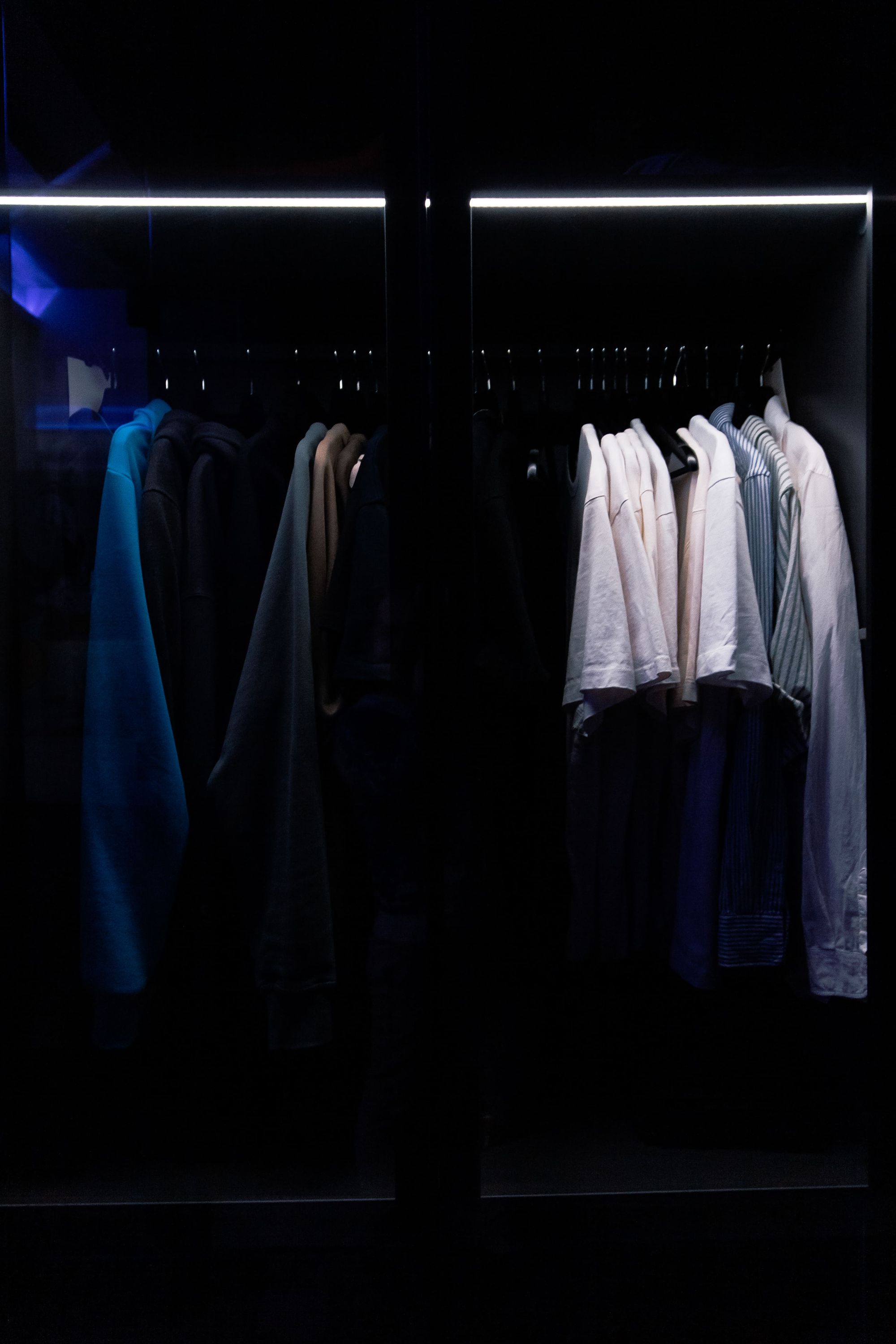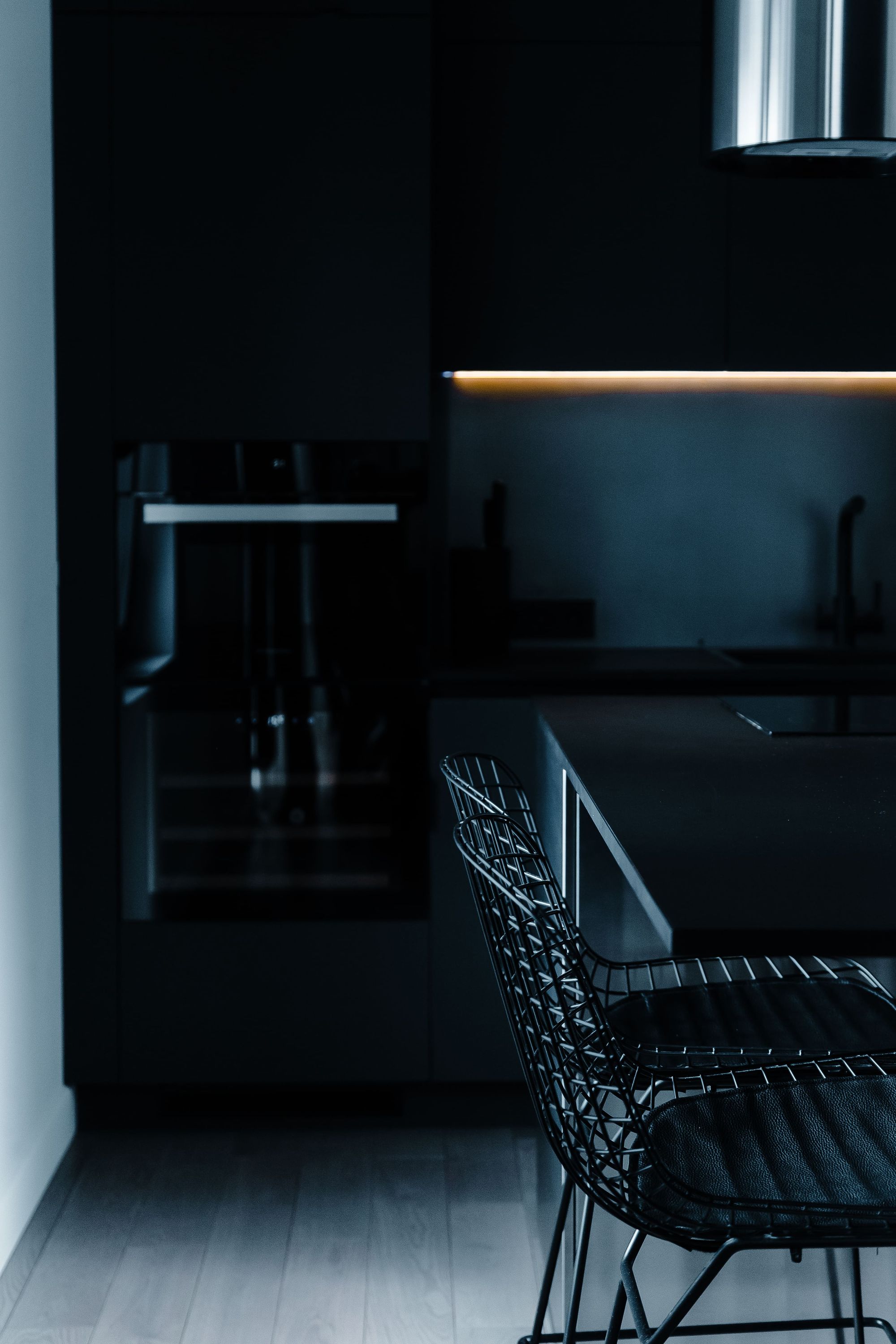 В гостиной парящий потолок гармонично соседствует с частью бетонного потолка без отделки. Подсветка стильного фиолетового свечения привносит свежесть и становится ярким акцентом в интерьере. Говоря об остальных источниках освещения, можно наблюдать общую концепцию лаконичности. Аккуратная акцентная подсветка теплого белого свечения разбавляет холодную цветовую гамму в интерьере.