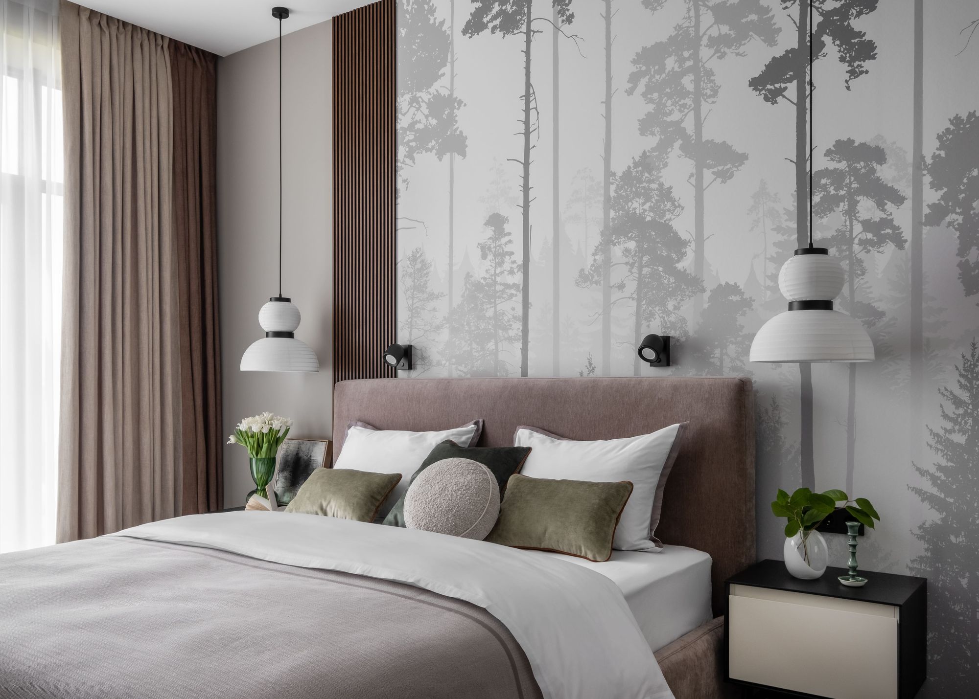 Месторасположение ЖК Spires во многом определило концепцию интерьера. За панорамными окнами квартиры на Нежинской улице в Москве раскинулся лесной пейзаж, который «проник» и внутрь пространства. Теплая цветовая гамма, состоящая из таупа, серого и белого оттенков, разбавлена элементами освежающего изумрудного цвета, а стены спальни украшены минималистичными фотообоями с изображением туманного леса.