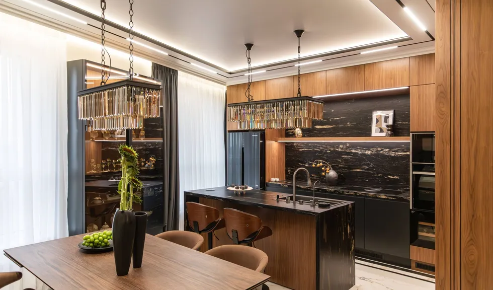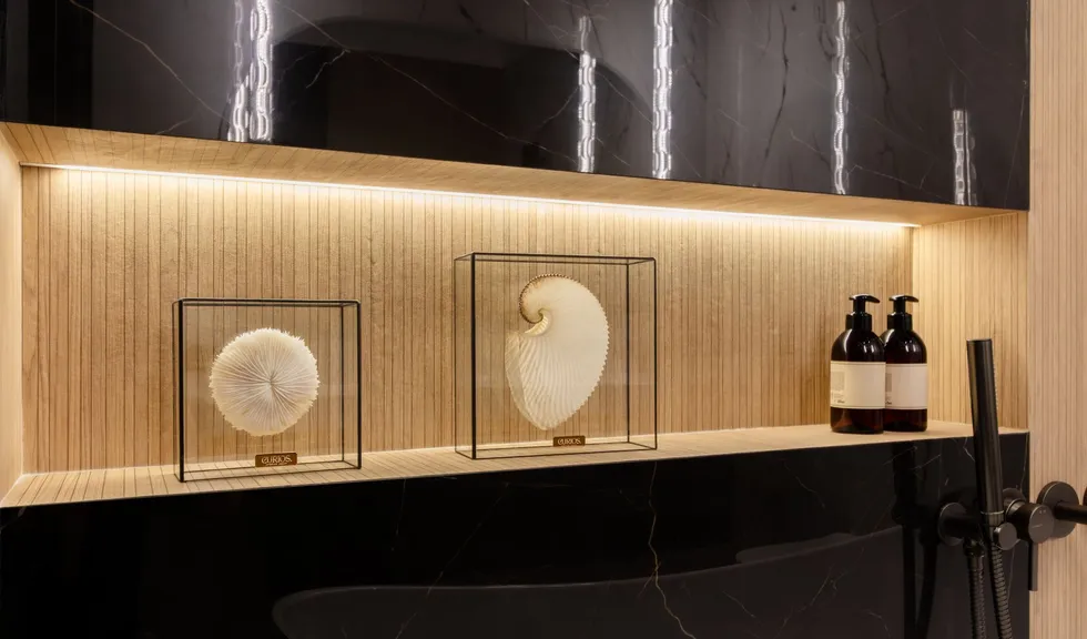 Основная цветовая температура в квартире — нейтральная, 4000 К. Однако подсветка, дающая ощущение уюта, чуть теплее — 3500 К.