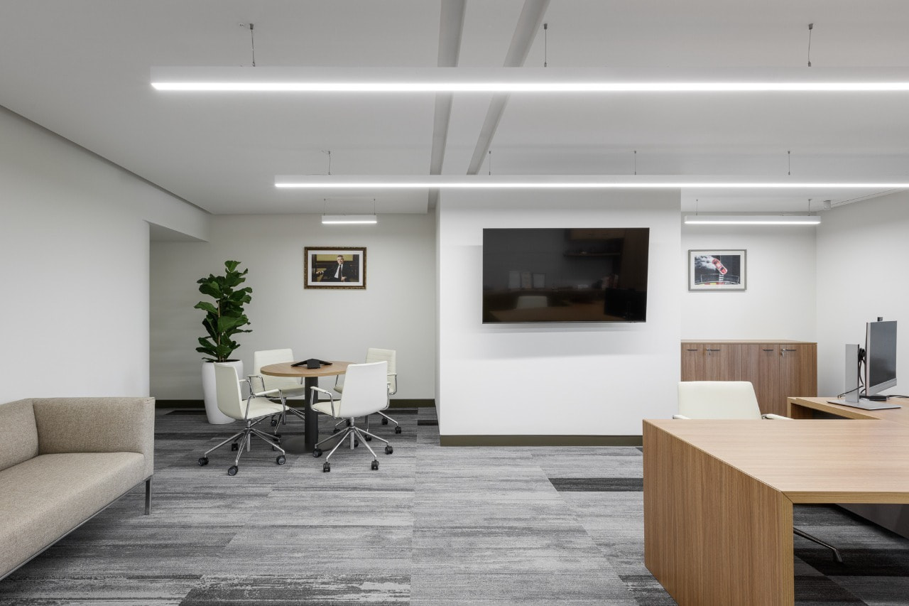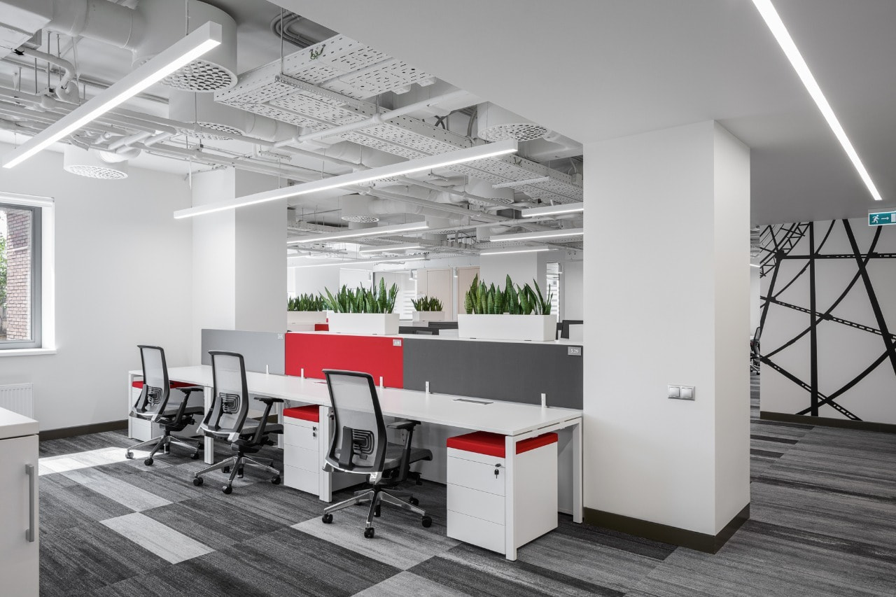 Трековые системы являются популярным решением для офисных пространств, и данный проект не стал исключением. В зоне открытого офиса трековая система в сочетании с подвесными линейными светильниками гармонично смотрится на фоне потолков с открытыми коммуникациями. Однако интерьер по-прежнему выглядит аккуратно и сдержанно за счет белого цвета как самой трековой системы, так и потолка, стен и мебели.