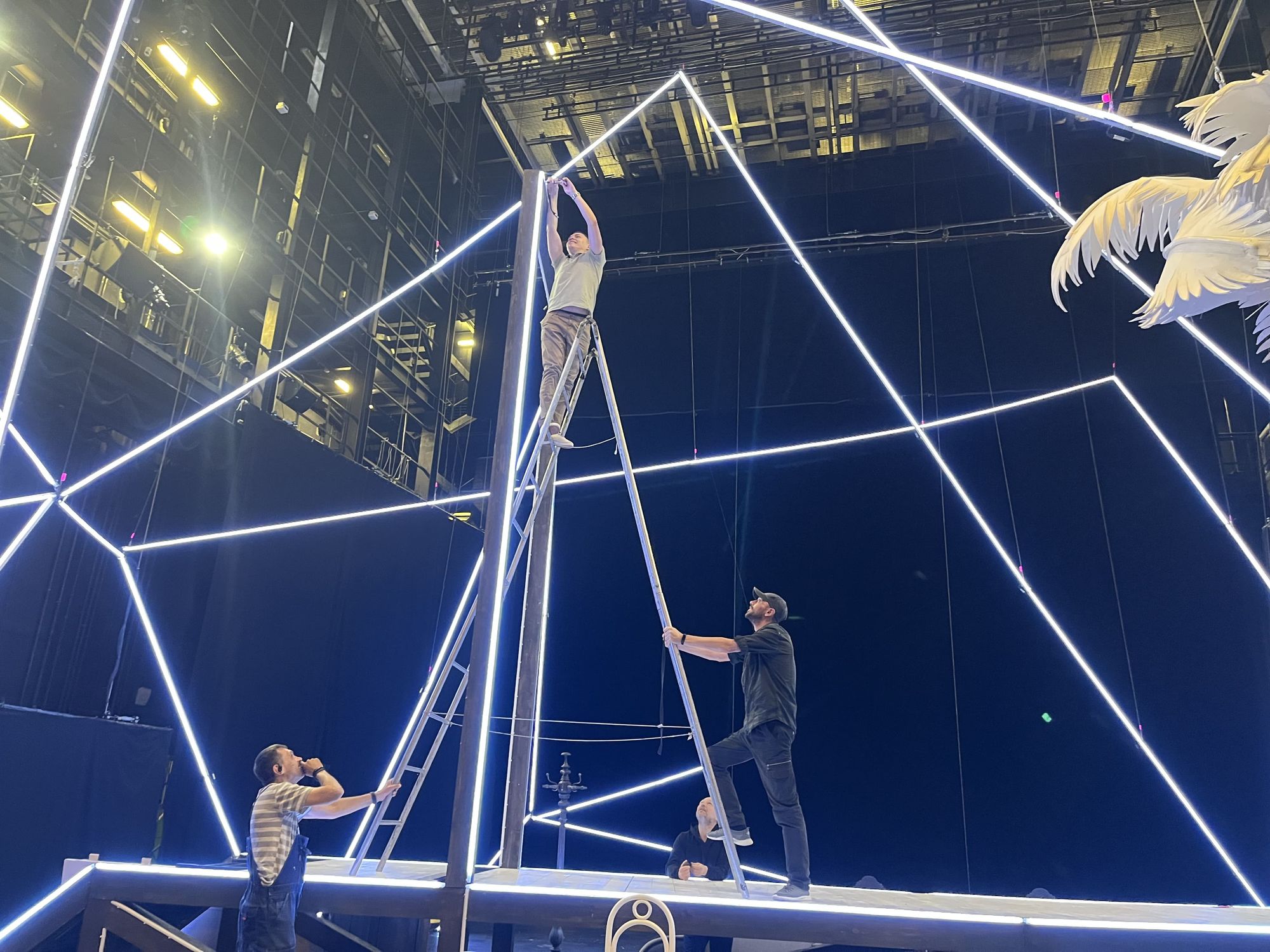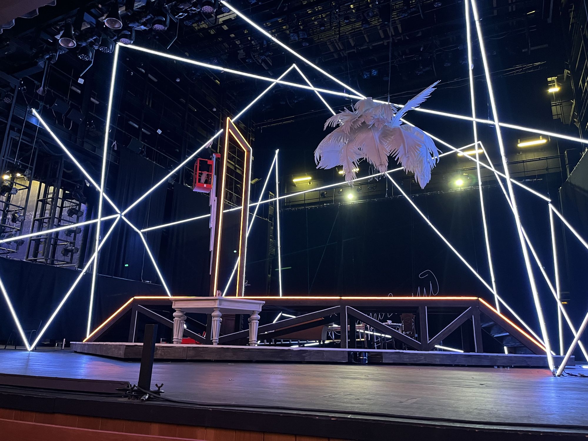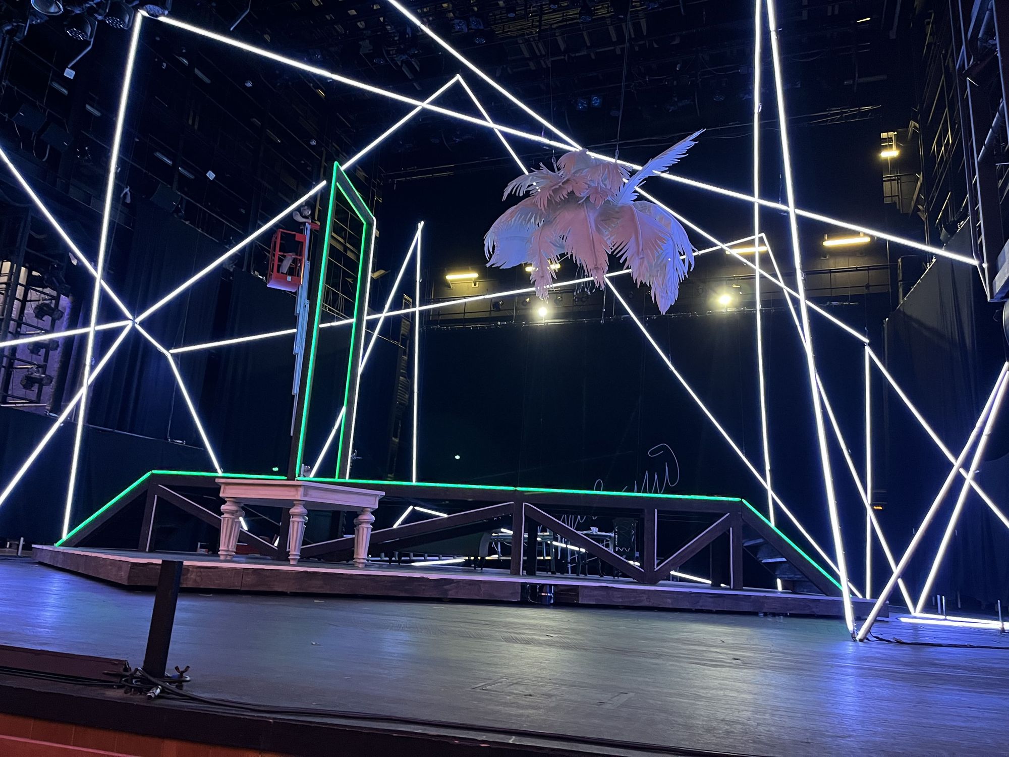 Композиция из ломаных линий света, напоминающая переплетения паутины, — это прекрасная альтернатива привычным театральным декорациям. Идея осуществилась благодаря круглому гибкому профилю WPH FLEX и RGB-ленте. Управление по протоколу SPI позволяет не только настраивать любые оттенки свечения ленты, но и создавать различные динамические эффекты, что немаловажно для оформления сценической площадки. Возведенный на ней помост также очерчен линией света по контуру, что выделяет конструкцию на темном фоне.
