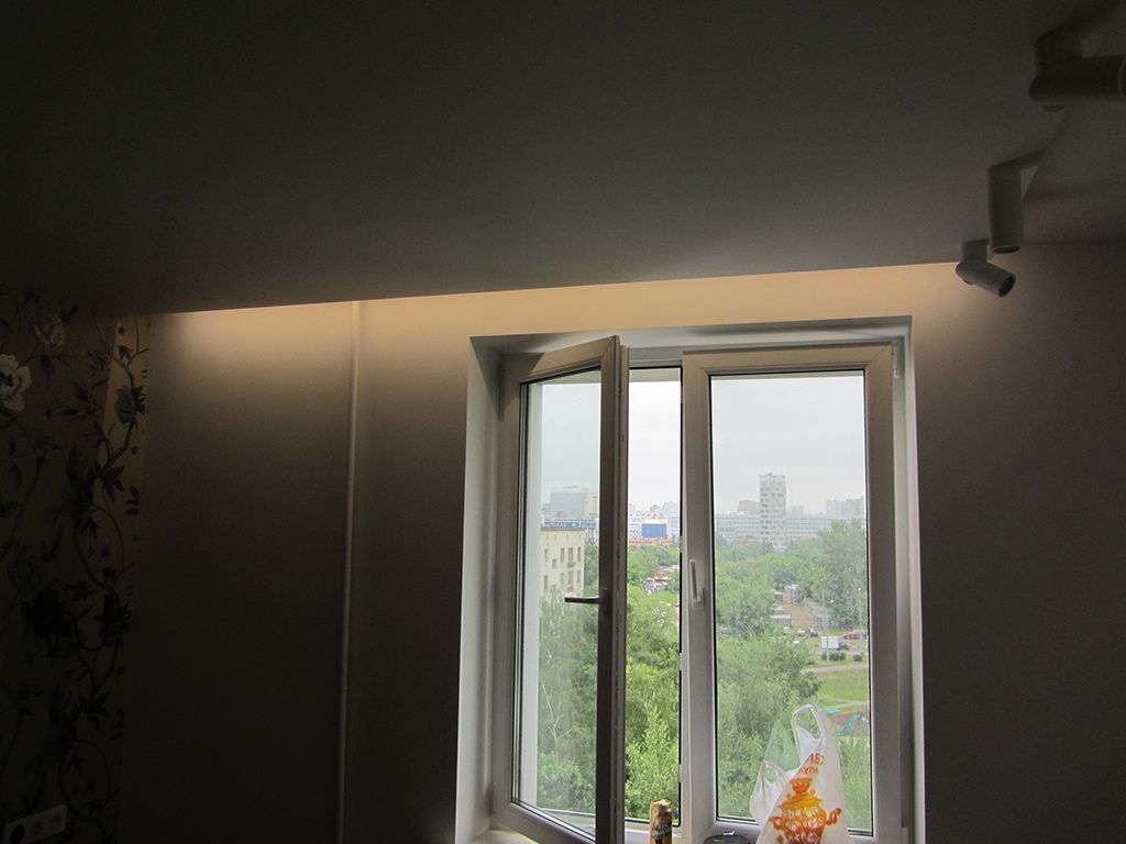 Важно отметить, что для равномерного свечения без засветок и полос, светодиодная лента должна быть установлена с равными, правильно рассчитанными промежутками. Для данного проекта количество светодиодных лент, промежутки между ними были рассчитаны заранее, в соответствии с площадью засветки. Проводка находится на одном уровне с лентой и не имеет провисающих участков, способных отбрасывать тень, которая будет видна на поверхности натяжного потолка.