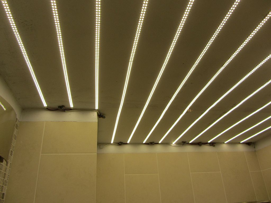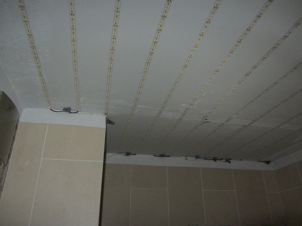 Так, в ванной комнате светодиодная лента разместилась по всей площади потолка. Таким образом, после установки натяжного потолка, будет светиться весь потолок целиком.