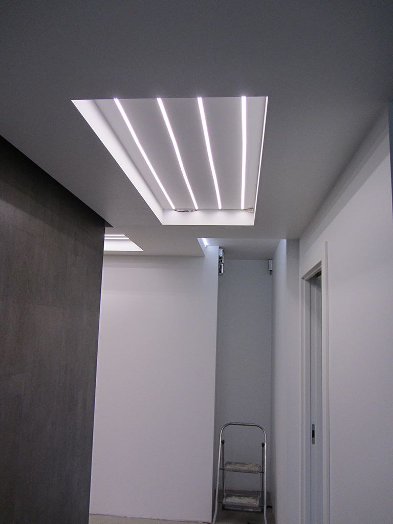 В прихожей и коридоре применено сразу две технологии монтажа потолков - гипсокартон и натяжной потолок. При помощи гипсокартона уровень потолка был опущен, появились ниши для декоративной подсветки и прямоугольные секции - углубления для организации основного освещения. В эти углубления, как и в ванной комнате, была установлена мощная двухрядная светодиодная лента Arlight дневного белого свечения. После установки светодиодных лент будет смонтирован натяжной потолок, который будет находиться вровень с гипсокартонным потолком. Таким образом получится единая поверхность потолка с прямоугольными светящимися участками.
