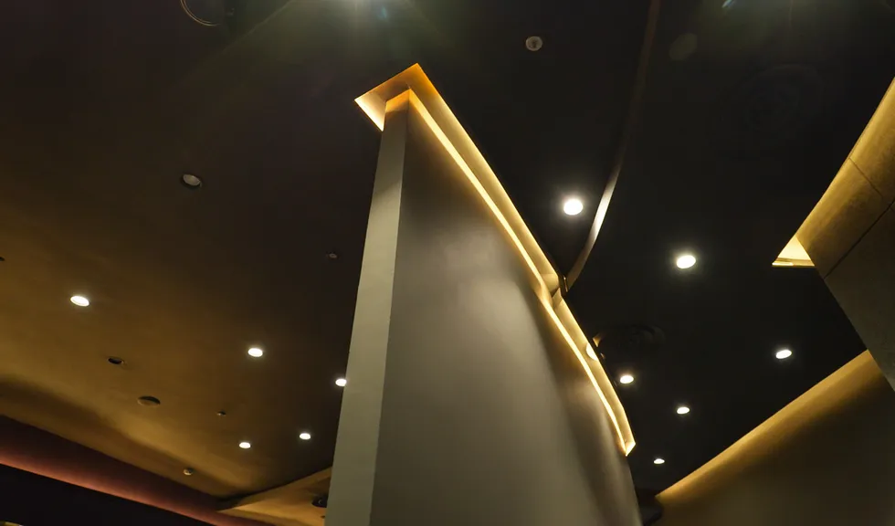 Заливающая светодиодная подсветка по периметру зала создает равномерное основное освещение.
