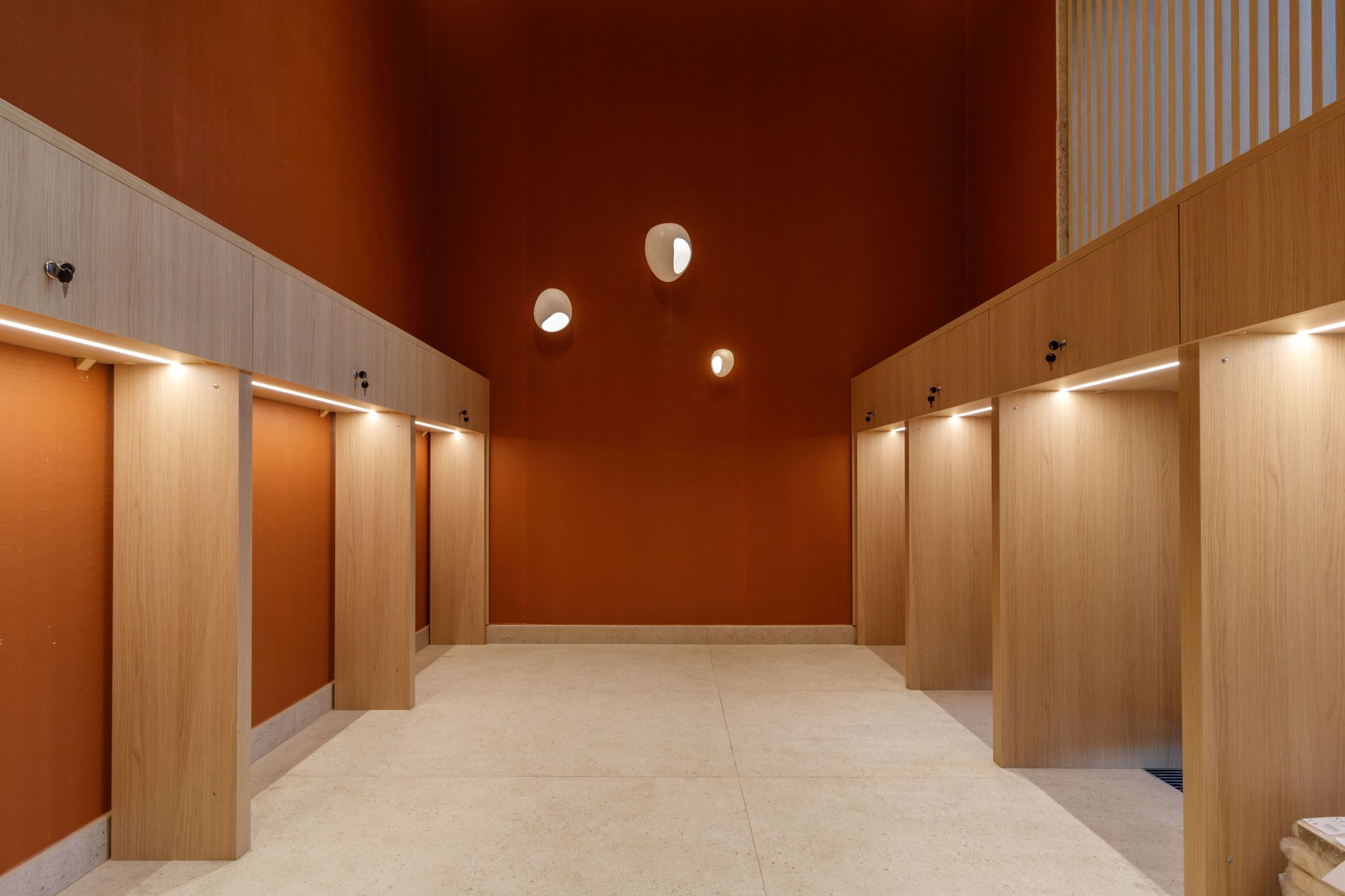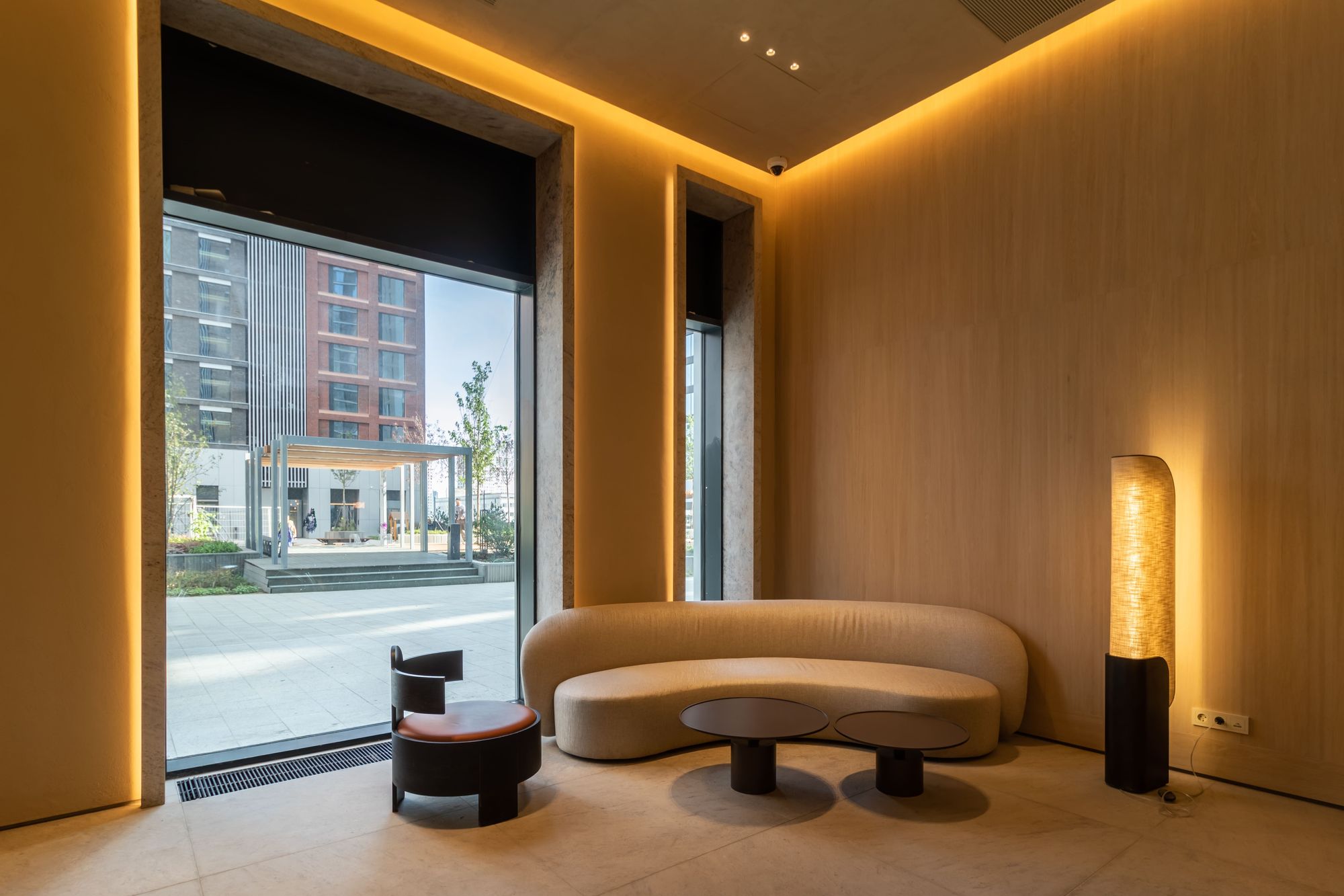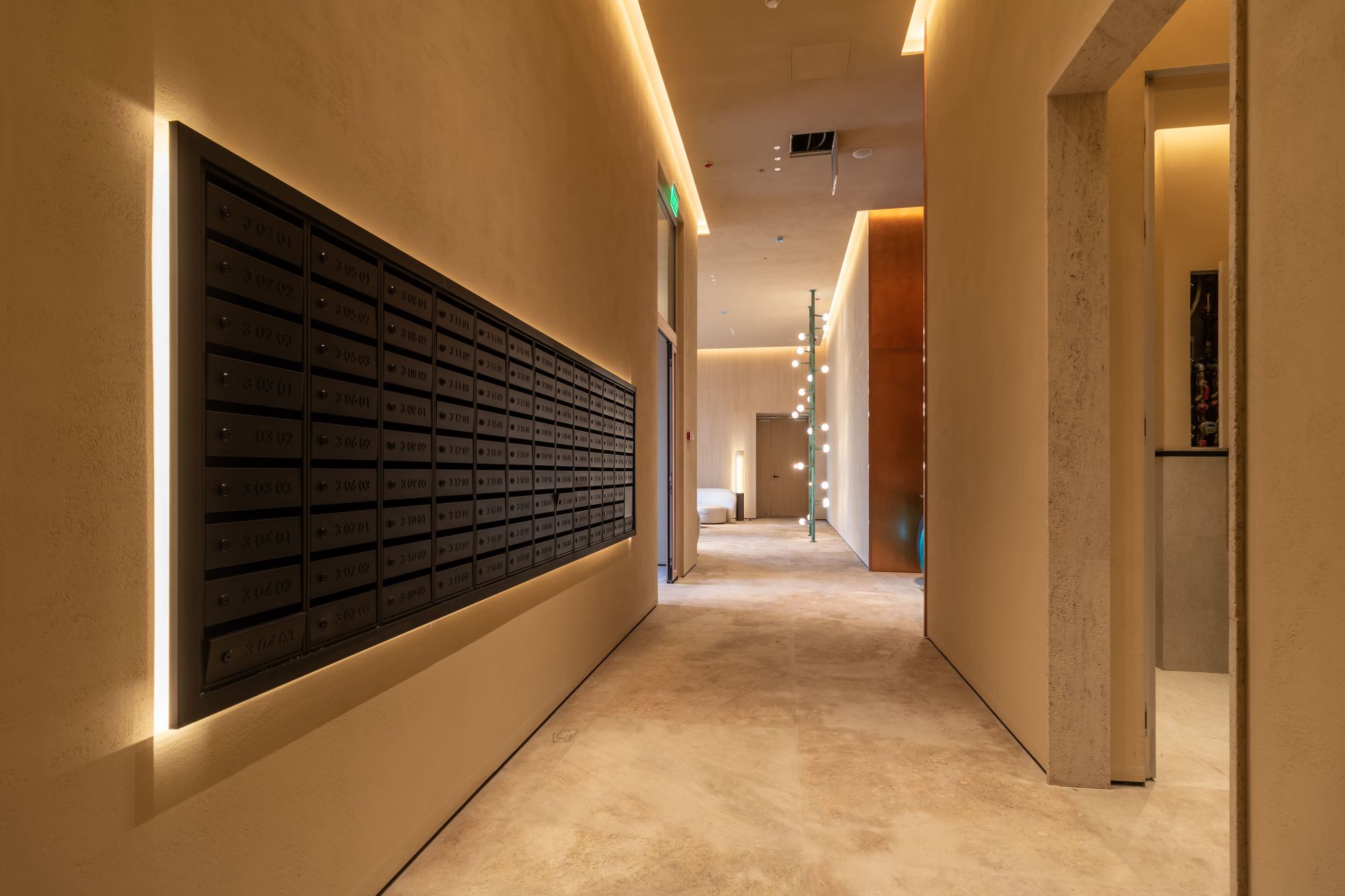 Природная концепция продолжается и внутри зданий. Жителей и гостей комплекса встречает просторное лобби в благородных осенних оттенках. Цветовую гамму помещения усиливают источники света с теплым белым свечением, создавая в лобби уютную и респектабельную атмосферу. Закарнизная подсветка на основе светодиодной ленты и профиля Arlight образует эффект парящего потолка, а также подчеркивает оконные рамы и зону почтовых ящиков. Встраиваемые даунлайты ATLAS, обладающие низким показателем дискомфорта (UGR<16) и небольшим углом излучения (35°), создают ненавязчивый комфортный свет.